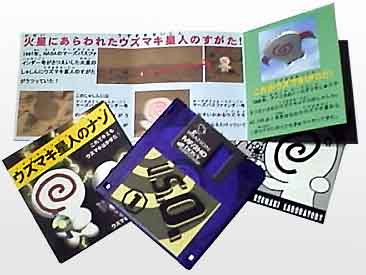 | 疾走感バツグンのオープニングムービー、ウズマキ星人の潜伏するアパートの1室を再現した「ウズマキルーム」、用途不明のウズマキ着せ替えマシーン「ウズマキスロット」を収録したフロッピーディスクです。特製ウズマキ封筒、当時流行のスケルトンボディで1998年〜2001年まで発売していました。 |